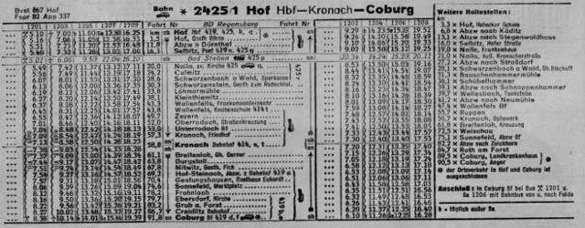 Tägliche Zugverbindungen waren laut Kursbuch in der Regel eine Tages- und eine Nachtverbindung je ein Zugpaar über Hof / Gutenfürst bzw. Ludwigsstadt / Probstzella für den Binnenverkehr der DDR und für den Berlin Verkehr ohne Halt durch die DDR. Was den wenigsten Bewußt oder Bekannt war, so gab es im Grenzverkehr auch zahlreiche Busverbindungen des Bundesbahn Bahnbusses der OVF bzw. RBO und Privater Anbieter die hier mit eingebunden waren.