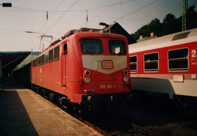 Im ersten Moment nichts besonderes an dem Foto V 60 und BR 232 am 26.08.1994 in Probstzella. Man könnte annehmen, daß die V 60 den Güterzug rangiert oder umsetzt. Weit gefehlt. 346 598 Bw Saalfeld wurde vor 232 325 Bw Saalfeld von Saalfeld bis Pressig vor dem Dg vorgespannt. Auf Grund der Gleisbauarbeiten und teilweise das nur ein Streckengleis zur Verfügung stand mußte die V 60 irgendwie durchgeschleust werden. So ging es mit 60 km/h als Vorspann und ab Probstzella mit Schub BR 151 über den Frankenwald. So entstanden vermutlich zahlreiche interessante Fotos oder besondere Bespannungen, die oft nur einmalig waren.